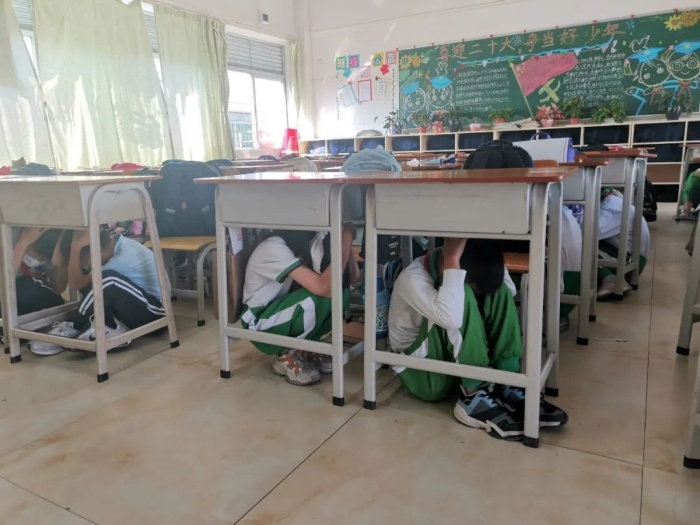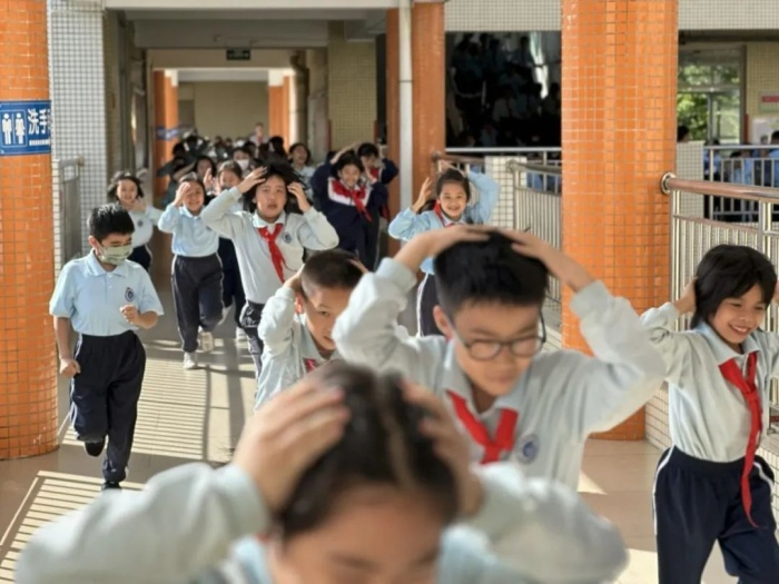 上午9点15分,随着校园内第一声紧急响亮的警报声响起,防震减灾演练正式开始。听到警报后,各班正在上课的老师迅速作出反应,组织学生们双手护住头部,迅速蹲到课桌底下避震。当第二次安全演练警报响起,各班学生在老师的引导下,双手护住头部,快速有序地从指定楼梯和线路安全逃生,迅速撤离到安全地带集中,各班及时清点并上报本班人员情况。