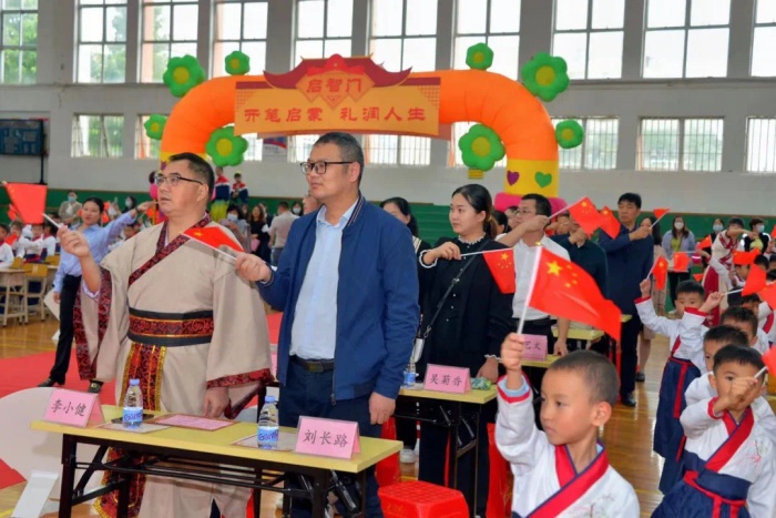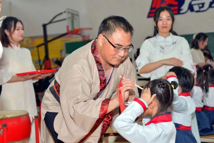 孩子们身穿汉服,在老师的带领下洗净双手,再拱手穿越启智门。行大礼前,净手以净其心,寓意着孩子们在成长过程中洗去浮躁、稚气、留下睿智与儒雅。拱手穿越启智门,象征着孩子们从今启智,学习尚礼、立志“博学笃志,切问而近思,做有理想之人,有德性之人,有文化之人”。