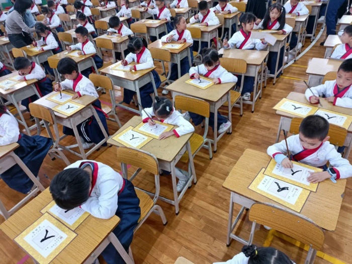 人字,一撇一捺,中正平和。孩子们在肖炜林老师的示范中,以一个人字开笔,寓意着在人生的启蒙阶段学会做人,像“人”字那样顶天立地,像人字那样堂堂正正!