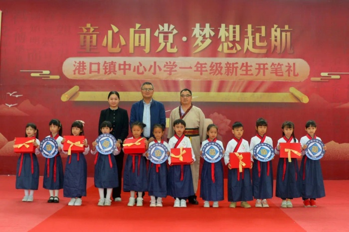 尊师重教承传统,开笔启智做栋梁。为大力弘扬中华优秀传统文化,感受传统文化的内涵与魅力,激励学生勤学苦读、尊师孝亲、崇德立志、仁爱处世,2022年11月4日下午,港口镇中心小学举行以“童心向党·梦想启航”为主题的开笔礼仪式。出席本次仪式的领导与嘉宾有港口镇教体文旅局刘长路副局长,港口镇教育和体育事务中心吴菊香德育专干,中心小学李小健校长、黄美玲副校长、梁文玲副书记、苏艺文副校长、梁润胜副校长等。