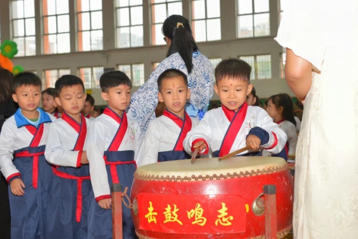 “鸣”通“明”,“鸣志”即“明志”,击鼓的声音越响,声音传得越远,说明志向就越远大。陈小娟老师代表老师们发言,殷切希望孩子们从小要立下远大理想,做一个有责任心和懂感恩的人!在陈老师的带领下,学子们心怀理想,庄严而神圣地击鼓鸣志。学子们个个精神饱满,意气风发。从此告别蒙昧,开始学习做人、学习做事,学习文化与知识。