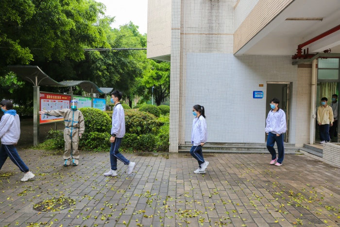 随后医疗保障组工作人员穿上防护服佩戴好医用外科口罩到班级,校医到达班级门口,为密接学生佩戴好医用外科口罩,带领该学生到空旷地区等待疾控转运车的到来。该校及时提供全校师生,工勤人员,来访人员等相关人员名单资料给疾控现场流调人员判定次密接:密切接触者所涉班级暂停线下教学3天,改为线上教学,按“三天两检”完成两次核酸检测,全员阴性后即可复课。次密接按规范转运酒店集中隔离,其余师生员工加强健康监测。