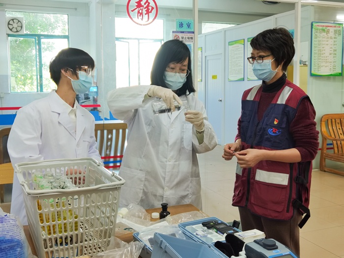 疾控的党员志愿者们分别在食堂为餐饮从业人员进行食源性疾病防控和营养配餐指导,为老师们进行了学校卫生标准的讲解,并对学校饮用水进行检测,指导学校落实相关学校卫生标准。