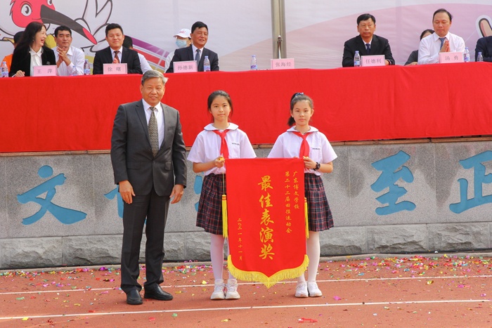 开幕式的最后,是由各学部分别带来精彩的团体操表演暨颁奖仪式。各学部各显特色、内容丰富、形式多样;学生们精神抖擞、英姿飒爽、朝气蓬勃。幼儿园小朋友稚嫩的身体随着动感的旋律灵活伸展,和老师一起带来一段可爱的《彩糖炫舞乐缤纷》,获得最佳创意奖;小学部的《yes ok》打着动感的节拍,踏着欢乐的舞步,感染了全场,获得了最佳表演奖;初中部学子的《美丽中国梦》让人看得目不转睛,彩伞飘飘,空竹高飞,获得了最佳风采奖;高中部学子们则带来了精彩的匕首操和军体拳表演,他们出拳虎虎生威,踢脚伶俐有力,最终获得最佳活力奖。