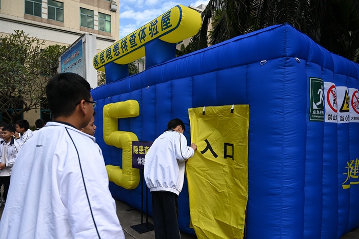 区别于简单的安全教育讲座课堂,本次活动以游园打卡的形式进行安全知识的趣味学习体验,创意新颖,寓教于乐。活动现场以家居隐患排查屋和火灾逃生体验屋为主背景,分别布置了触电体验、防护用品、应急救护、模拟灭火等主题学习区域。宣讲员以班级为单位进行分组,组织学生逐一体验,同学们积极穿梭在这几个主题学习区域间,争相学习体验安全知识,在玩乐中化被动接收为主动学习。在急救安全知识宣讲环节,宣讲员结合具体案例向大家讲述了突发事故常识性急救方法,并通过人体模型演练的方式,现场指导学生正确掌握心肺复苏的方法步骤。通过各类项目,孩子们体验了消防器材、防毒面具、应急用品等安全设施,学习了消防安全应急演练以及各式卫生急救小知识,收获满满。