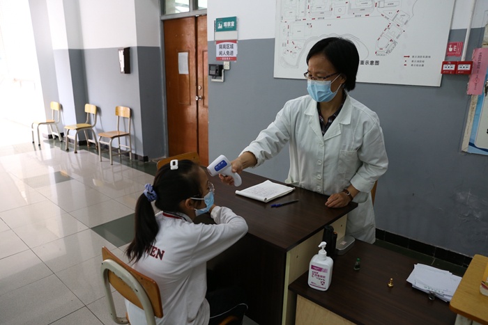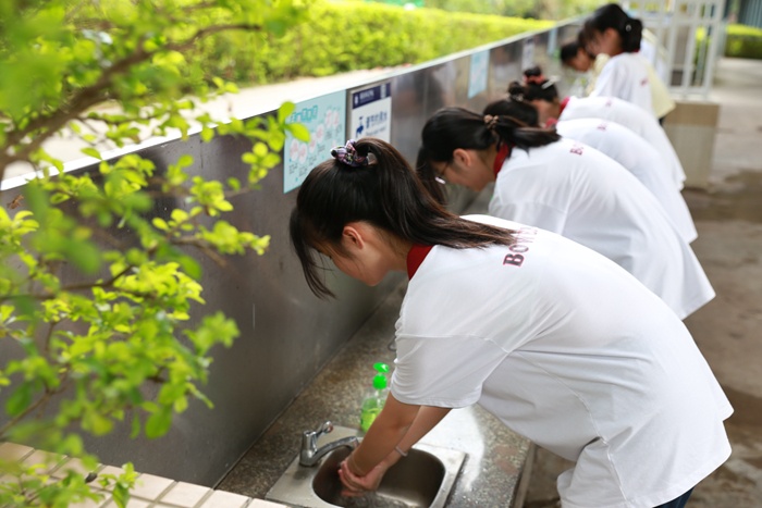 演练正式开始,学生入校前间隔一米,依次通过体温检测、身份核验方可进校;值日老师宿舍门口手持额温枪指引学生进行体温测量,一天三次对进入宿舍师生进行体温检测,异常情况及时报送校医室并处理。学校饭堂提前安排好学生就餐座位,学生就餐前排队,七步洗手、排队取餐、有序就餐、回收餐具、离开餐厅等有条不紊。