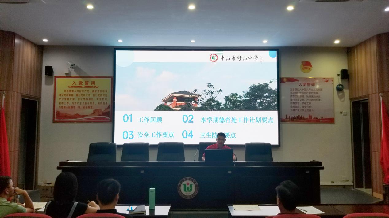 金秋九月,和风送爽。9月5日,桂山中学德育处在党员活动室组织召开了新学期第一次全校德育工作会议。校团委、各年级组、全体班主任、心理科组和学管组成员等共80余人,一起共同商定学期德育工作安排。主管德育线的党委副书记、副校长陈福生出席会议。