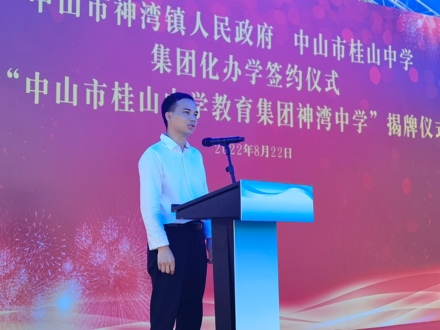 神湾镇党委委员、副镇长杨志文代表镇党委政府向所有支持神湾教育事业的领导嘉宾表示感谢。他表示,中山市桂山中学是全市知名的百年名校,拥有一流的师资力量和优质的教育资源,神湾中学也是神湾镇建校时间最长的一所公办初中,此次与桂山中学开展集团化办学,对于提高神湾镇教学质量、促进教育均衡、推动教学改革具有重要意义,更是神湾镇优化营商环境,加快提升公共服务水平的重要举措。