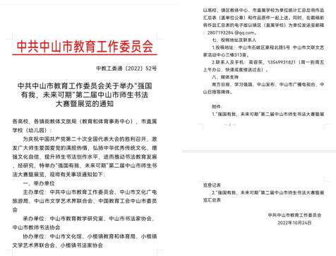 为庆祝中国共产党第二十次全国代表大会的胜利召开,激发广大师生爱国爱党的满腔热情,弘扬中华优秀传统文化,增强文化自信,提升师生书法创作水平,进而推动书法教育发展,由中共中山市教育工作委员会举办“强国有我,未来可期”第二届中山市师生书法大赛,我校师生积极组织参加。