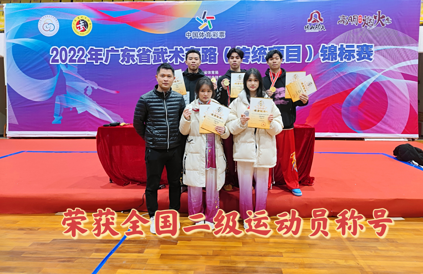 2023年1月15日,2022年广东省武术套路 (传统项目)锦标赛在佛山市广东华体高明体育馆圆满落下帷幕。桂山中学武术队在陈伟栋老师带领下,队员们发挥出色,斩获3金2银的好成绩,5名同学荣获“全国二级运动员”称号。
