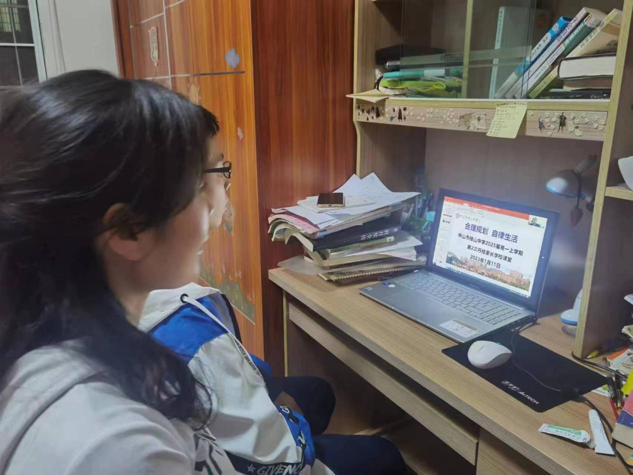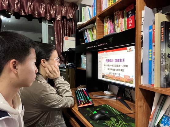 丁主任首先以照片和视频等形式分享了本学期同学在校生活的点点滴滴,一张张照片勾起了同学们在桂山的成长初记忆。与班主任的初次见面会、入学教育讲座、刻骨铭心的军训、我爱我班团康活动、叠被子大赛、模拟法庭、社团招新、运动会和段考,一次次精彩活动照片切实让家长感受到孩子在桂山的适应、成长与变化。丹桂家长学校课堂部分,丁主任从构建积极和谐亲子关系、合理规划和应对统考、以德育作业陪伴成长、认识自我与理性选科、寒假安全等方面向家长和同学强调了寒假期间要注意的事项
