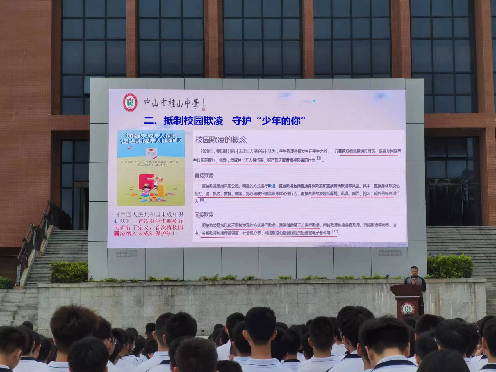 接着,陈建科副主任向同学们介绍了校园欺凌的类型、处置办法及面对欺凌学生该如何保护自己,并呼吁全体学生一起抵制校园欺凌,一起守护“少年的你”。随后,他提到桂山中学是广东省防震减灾科普教育基地,是国家防震减灾科普示范学校,学校一直非常重视防灾减灾教育,本周学校将举行2023年桂山中学防震(防火)避险应急疏散演练活动,并介绍了活动的具体方案和流程,希望借此疏散演练,进一步提升同学应急逃生技能。提醒同学们要时刻加强安全意识,努力增强自我防范能力,做到警钟长鸣。