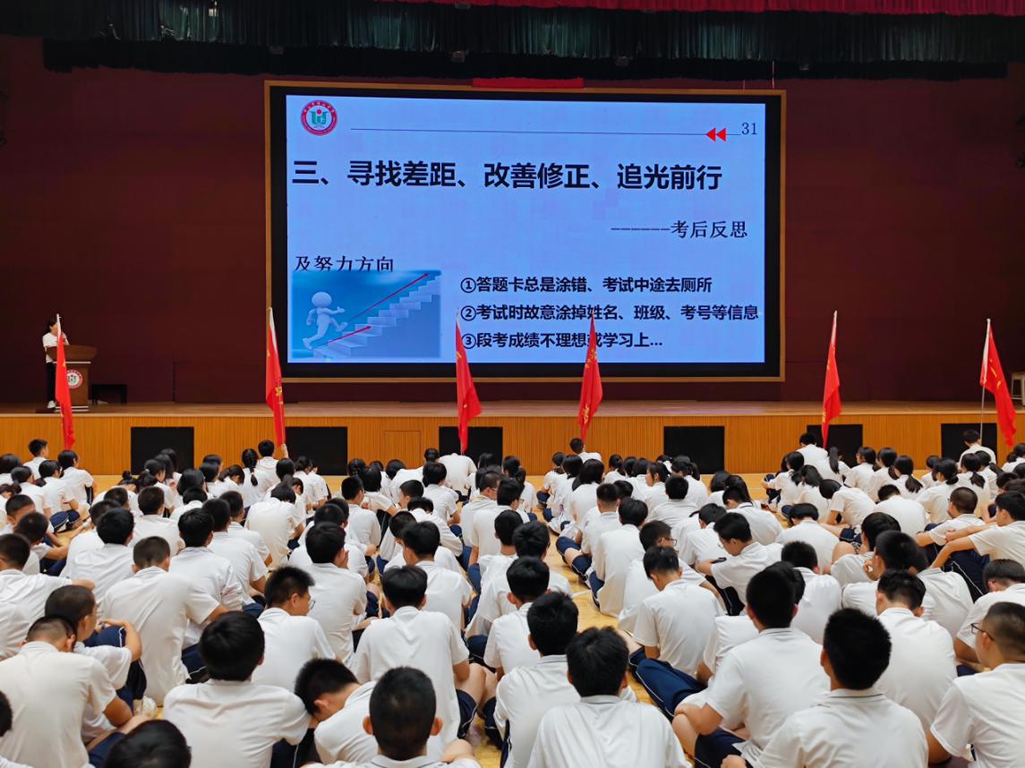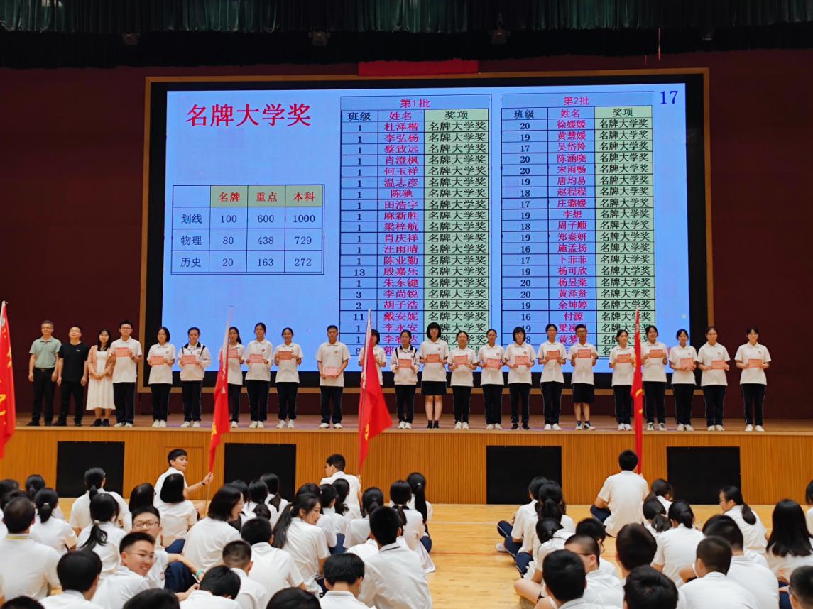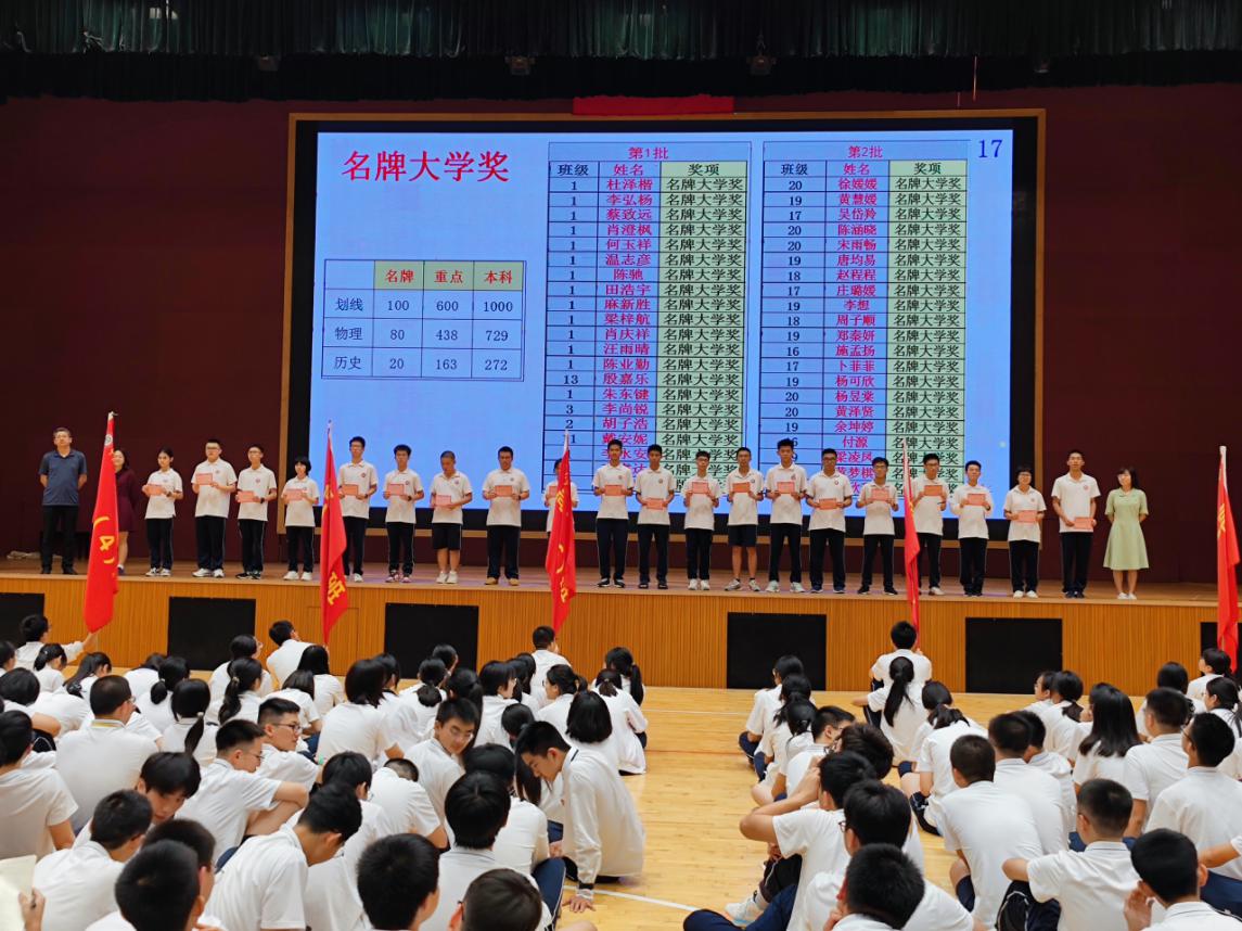 张会芬级长详细地向全体同学介绍了新高考模式下的赋分原则和成绩统计依据,并结合本次考试总体情况进行了分析。在表彰环节,获得名牌大学奖、重点大学奖、单科奖、进步奖和优秀班集体奖的同学和班级依次上台,各班班主任逐一为他们颁奖,台下同学也送上热烈的掌声,获奖同学深受鼓舞。