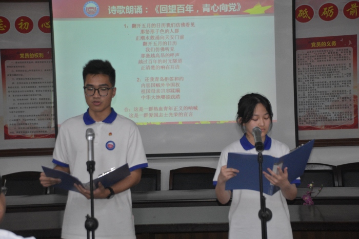 2022年新团员入团仪式正式结束后,团员代表高二6班罗子谦、高一8班杨乐带来诗歌朗诵《回望百年,青心向党》,表达了对“五四”运动的深刻纪念。