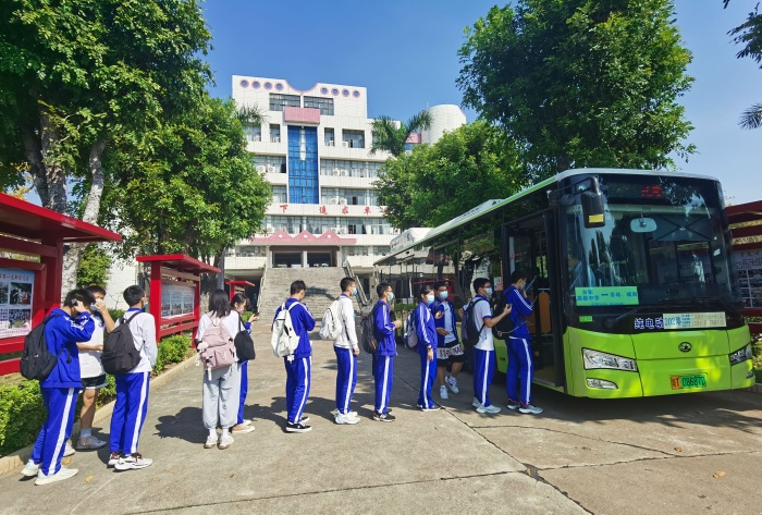 针对这一问题,学校通过三轮问卷信息的收集,制定了“公交车进校园,为广大学生提供‘定制’服务”的计划,并与中山市公交集团公司、古镇交通分局等多方协调,公交集团为古高制定了两条公交专线,线路覆盖富华总站、城南总站、东凤车站、南头车站、黄圃镇政府站等。