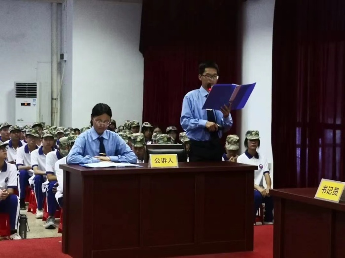 2021年10月20日,秋风飒爽,阳光明媚,在中山国防教育训练基地综合楼,中山市古镇高级中学2021级高一全体学生正在观摩学生模拟法庭活动。会场的陈设高度还原了法庭现场。所有学生正襟危坐,准备好投入鲜活生动的案件现场。