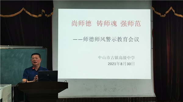 谭杰玉副校长以“尚师德,铸师魂,强师范”为题进行师德师风警示教育,他领学解读了《新时代中小学教师职业行为十项准则》《中山市中小学有偿补课和教师违规收受礼品礼金问题专项整治实施方案》《中山市师德师风建设三年行动计划》等相关文件精神,要求全体教师要提高自身修养,弘扬新风正气,落实为党育人、为国育才的根本任务。