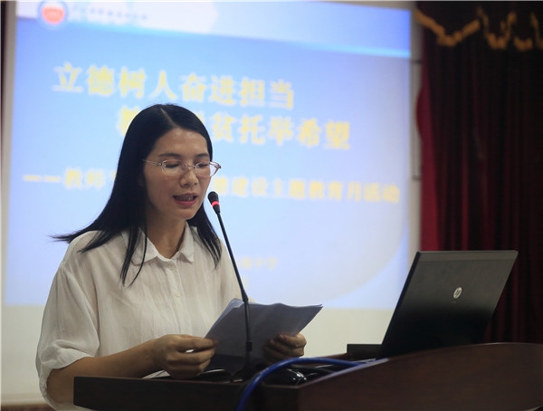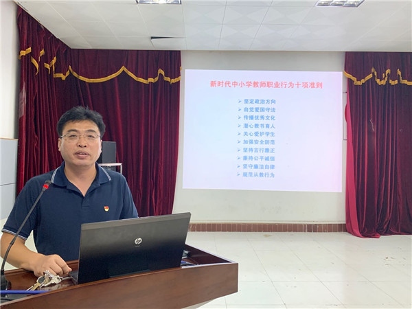 校党总支纪检委员王学智同志宣讲了《新时代中小学教师职业行为十项准则》、《中小学教师违反职业道德行为处理方法》相关条例,希望全体教师提高政治站位、坚定政治方向,认真学习贯彻习近平新时代中国特色社会主义思想,践行社会主义核心价值观,提高法治意识,规范从教行为,自觉做到自重、自省、自警、自励。