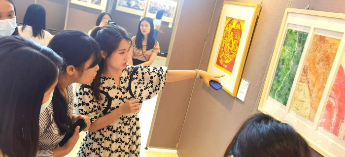 展厅内,在刘老师的个人作品《是自然的馈赠》前,同时也驻足许多前来交流的各校教师,各校之间关于专业技法与少儿版画教学的探讨,使这次的联展交流氛围愈加浓烈。