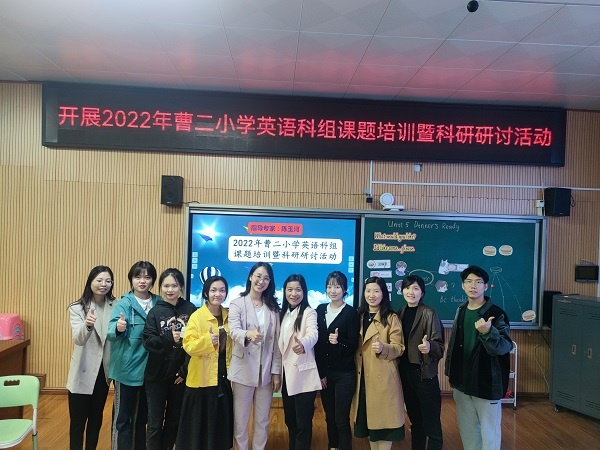 本次活动邀请到中山市实验小学英语科组长陈玉河老师参加,曹二小学麦彩英副校长以及曹二小学、曹一小学全体英语老师参与了本次教研活动,上荣小学的老师则通过线上直播的形式参与。