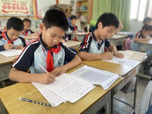 在低年级硬笔书法书写中,大家可以看到同学们在老师的指导下,坐姿端正:头正、肩平、身直、足安,一尺、一寸、一拳。专心致志,以横平竖直、刚劲有力的硬笔书法,书写汉字之美。