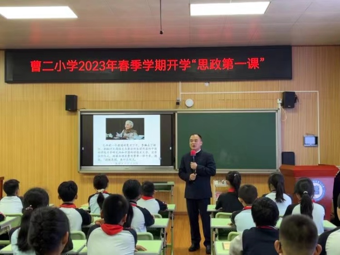 思政引领,铸魂育人。2月9日下午,曹二小学党支部书记、校长邱波为曹二小学全体思政老师、六年级学生带来了以“我追寻星辰大海的底气,是你给的”为主题的思政宣讲第一课。希望曹二学子在新的一年里,在党的阳光照耀下,在学校老师和家长共同关怀和培养下,找准目标,培养良好习惯与品格,一步一步走向更美好的未来。
