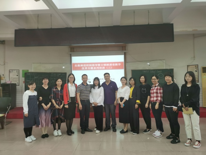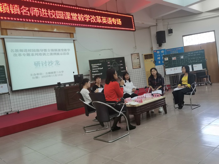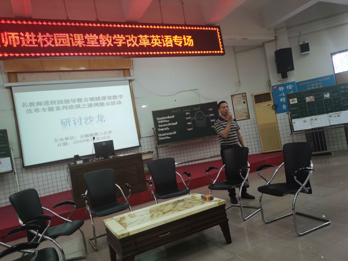廖秋菊副校长主持本次活动。在廖校长的主持下“名教师进校园指导暨古镇镇课堂教学改革专题系列培训”研讨沙龙,开展得如火如荼。许市中学刘海霞老师则认为这两节课已经很好地吸取小组合作与自主探究学习模板的形式和内涵,是非常精彩的课改课例!最后,古镇镇教育指导中心陈和添主任高度肯定曹三小学的常规教学工作,高度表扬了曹三英语科组的改革模式,评价执教教师能力非常出色,整体团队凝聚力强,在短时间内打造出一个非常令人满意的创新型教学模式,为古镇英语课堂改革开创了精彩的先例!