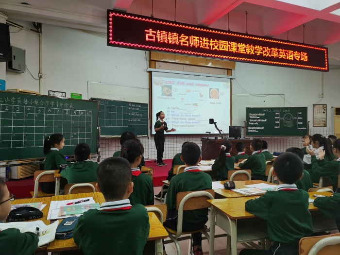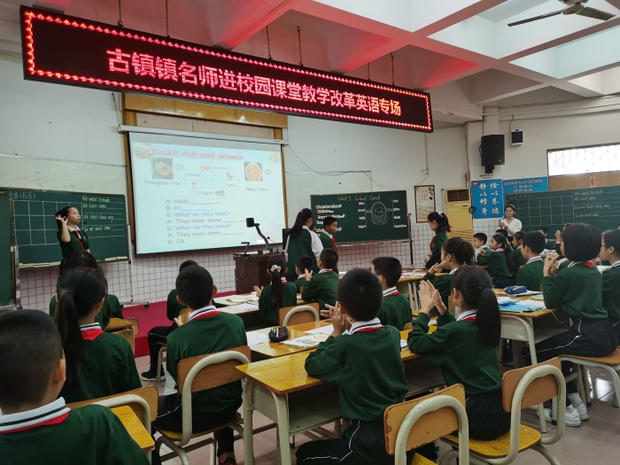 2020年11月16日早上8点,古镇镇曹三小学英语科组开展“名教师进校园暨古镇镇课堂教学改革”专题教研活动,古镇镇全体小学英语老师观摩。这次活动分为三个议程,首先由黄文娣老师和黄金乔老师就如何落实小组合作学习上展示课,资深黄文娣老师执教六年级Unit5 <A Circus in the Park>词汇课,而年轻教师黄金乔老师执教五年级Unit5 <School lunch>词汇课。接着许市中学刘海霞和古镇莫晓巧,蔡淑娴老师进行评课,最后由镇教育事务指导中心陈和添主任做专题培训指导。