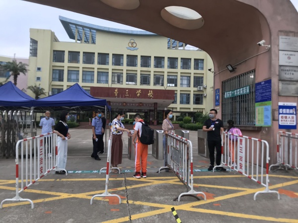 入校检测,安全有序。早上7点,曹三小学全体行政领导以及值日教师就到校等候同学们的归来,组织他们按要求排队,间隔1米以上有序入校。值日教师依次对学生进行测温,虽然天气不好,还下着雨,但整个过程井然有序,一刻也没有出现拥挤和扎堆的现象。学校外聘校医生亲自到校,随时做好准备,做好指导发热学生的应急处理方法。