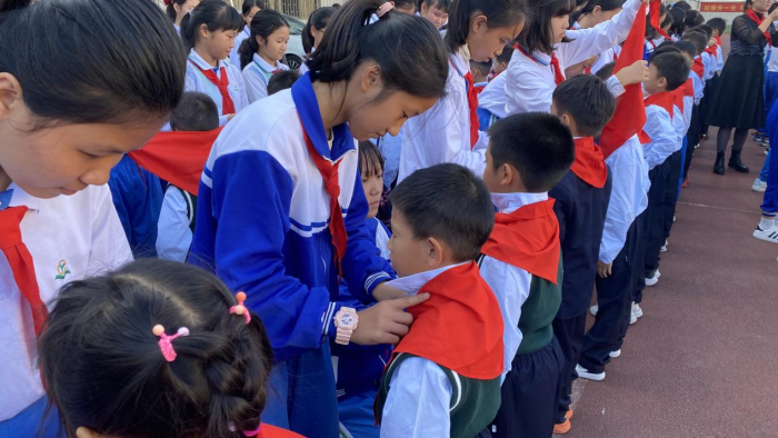 接着,大队辅导员谢睿老师庄重的宣读了组建一年级少先队组织的决定及新队员名单,一年级87名小学生被批准加入中国少年先锋队,正式成为光荣的中国少年先锋队队员,六年级的老队员们郑重地为新队员系上鲜艳的红领巾,新队员们回敬标准的队礼。