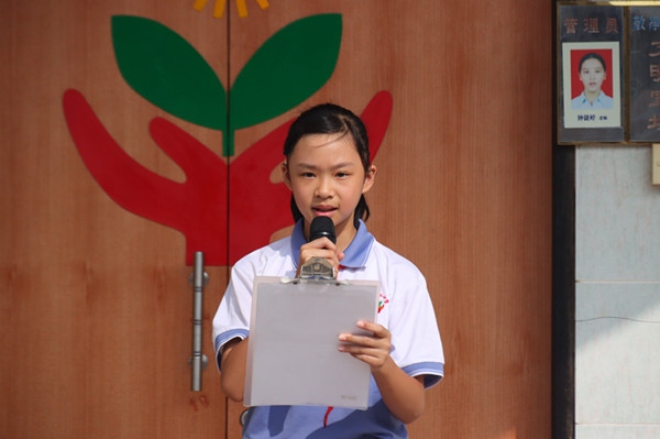 9月10日大课间,五3班的林倩婷同学代表全体同学向全校老师献词。她将无私奉献的老师比作人梯、园丁、春蚕和蜡烛,言语中流露着对老师的感恩之情。她满怀深情的话语,饱含激情的言辞感染了在场的每一位师生。