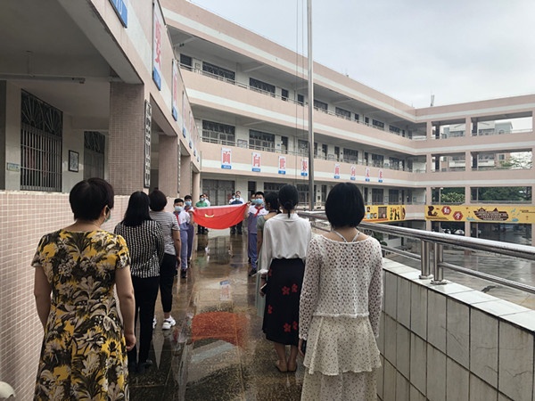 上午八点整,升旗手、护旗手早已做好准备,由潘启钦校长、刘沛昌主任和教师代表组成的国旗护卫队,在国旗台两旁排着整齐的队伍,升旗仪式在庄严肃穆的《义勇军进行曲》中拉开了序幕,四至六年级师生立足各班教室,师生们佩戴口罩,分散肃立,仪式在五(3)中队周琪主持下开始,“全体肃立!升国旗,唱国歌,少先队员行队礼,其他师生行注目礼。敬礼!”少先队员们庄严注视教室屏幕前五星红旗冉冉升起,行着标准的队礼,一起感受着这激动人心的时刻,以良好的精神面貌开启返校复课第一天。