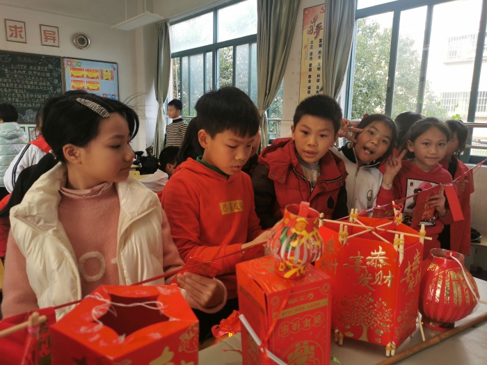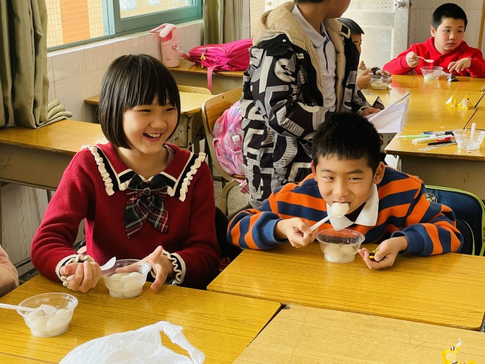 有的班级穿上节日的盛装,手里拿着亲手制作的彩灯,兴高采烈进行合影。有的班级举行猜灯谜活动,内容涉及动物、植物、日常用物、字谜、成语……大伙儿都争先恐后地猜起谜语来,兴致高涨,有的三五成群,有的和同学结伴商量或驻足凝神,或喃喃自语,或热烈讨论,或欢呼雀跃,孩子们领到喜爱的奖品乐滋滋。五六年级的同学们纷纷卷起袖子,准备馅料,拿着面团高高兴兴地搓着小圆子、学着包汤圆,“汤圆好好吃……”,整个过程充满了元宵节祥和温馨的气氛,一碗碗元宵,盛满了甜蜜。