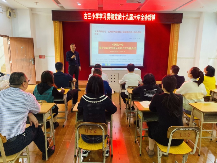中国共产党第十九届中央委员会第六次全体会议于11月8日至11日在北京召开。古三小学全体党员纷纷通过电视、电脑、手机、学习强国等媒介自主学习全会公报。11月15日上午古三小学召开“深悟百年成就 开创美好未来”——学习贯彻党的十九届六中全会精神专题学习会。