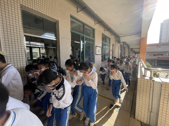 早上8点55分,演练正式开始,第一声长的鸣笛声表示地震发生,学生迅速蹲到桌子下面,用双手保护头部。第二次鸣笛声响起,学生们迅速有序疏散到学校的操场上。学生撤离到安全地点后,各班体育委员及时整理队伍,检查男女生人数,报告班主任,班主任向年级组长报告,年级组长将情况报告总指挥。