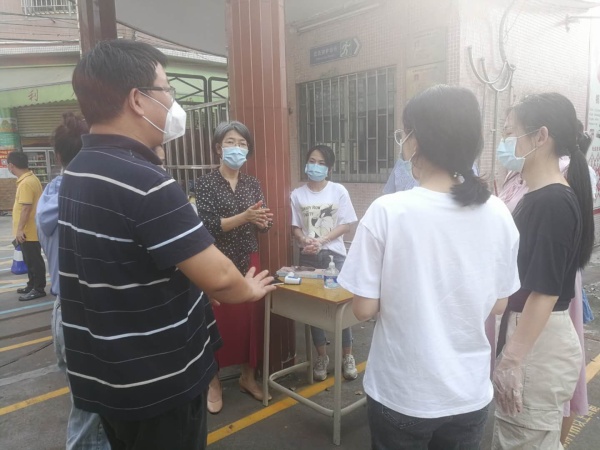 接着进行新冠肺炎疫情应急处置演练。情景一:学生在家长的陪同下来到校门口,学生听从保安和值日老师指挥,保持1米距离排队进校,体温正常进入校园。情景二:发现一学生体温高于37.3°C,并有咳嗽等症状。值日老师把学生立刻带到隔离观察室进一步测量体温,了解近期活动轨迹,学校应急小组马上启动应急预案。情景三:上课时,发现有同学呕吐。上课老师马上紧急组织学生撤离课室。处理过程:1.询问情况,有无疫区接触史。2.二次测体温。3.电话通知家长到校。4.做好登记上报工作。5.家长接小孩回家,去医院做进一步检查。古三小学卫生健康副校长蔡燕颜医生对如何处理这些突发事件做了更加细致的指导和说明。