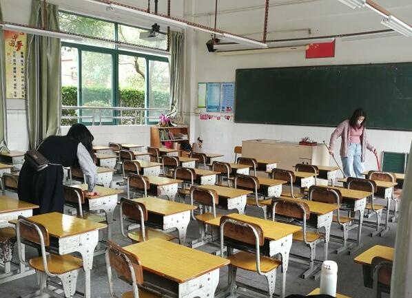 学校召开了疫情防控工作会议,由陈凯校长主持布置相关工作,统一安排,协同分工。老师们分组到各班去打扫卫生,进行班级课室桌椅的清洗消毒和搬运。将桌子尽可能按最大距离摆开,单人单桌,严格规范桌椅的消毒、数量限制与摆放,让学生复学后能保持安全距离。在消毒过程中,老师严格按照相关要求,认真配好消毒液,对各班教室、桌椅等进行全面喷洒消毒,不留死角,不留盲区,努力创造安全卫生的校园环境。在大家同心协力的努力下,顺利完成校园消杀任务。