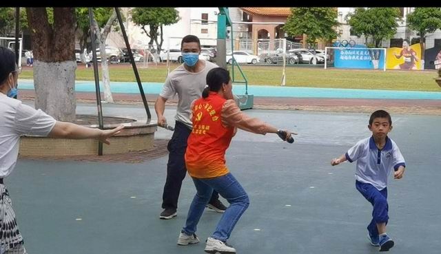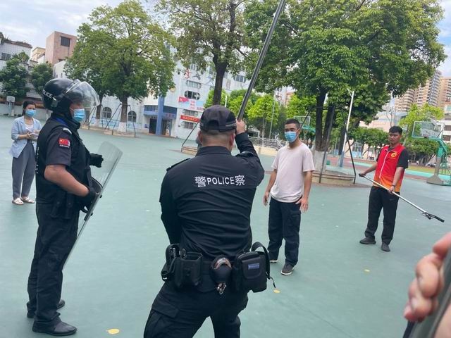 演练开始,学校模拟下午4:10学生如常下课,在操场上玩耍嬉戏,因保安员个人原因离开保安室忘记关上南门铁闸门,有一滋扰者(为轻度精神病患者)突然闯入,神色凶凶,正向有学生的方向跑。保安员持械立即上前制止,与滋扰者对峙;另一名保安员立即按响一键报警系统向市110指挥中心报案及校园危险警报信号。