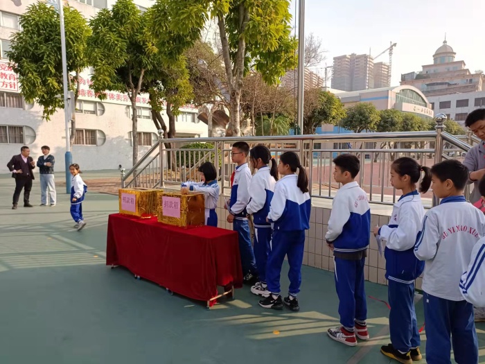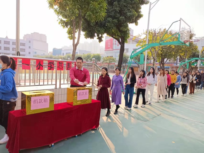 1月7日上午9点,古一小学全体师生齐聚操场举行2022年慈善捐款仪式。首先,德育副主任王易蓉宣读慈善万人行捐款倡议书。接着,教师队伍按顺序依次上台捐款。随后在班主任的带领下,各班学生代表依次上台,把手中的善款放入捐款箱内,伴随着悠扬的旋律,整个捐款活动积极而热烈,点滴爱心汇聚成爱的海洋。