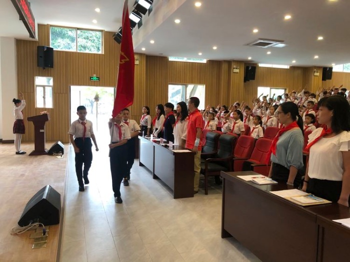 会议在队旗出旗中拉开序幕,少先队员们雄姿英发,步伐矫健。全场敬队礼,把整个仪式带入了庄严肃穆的氛围中。出旗仪式后,全体少先队员高唱《中国少年先锋队》队歌,嘹亮的歌声响彻整个报告厅。