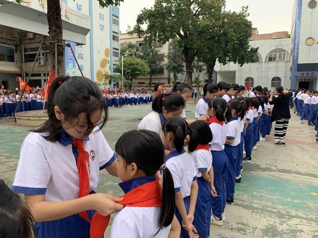 早上9点,古一小学各中队集合操场参与了本次的新队员入队仪式。出队旗仪式完毕后,操场上放着《红领巾之歌》,六年级的“老队员”为新队员授红领巾;张洪娣校长为新辅导员授红领巾和颁发聘书。新队员佩戴着红领巾,全体新入队的同学在少先队大队辅导员王易蓉主任的带领下,在庄严的队旗前宣誓,时刻准备着为共产主义事业而奋斗!紧接着,张洪娣校长为新中队授中队旗。