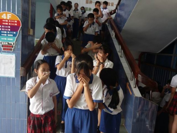 学生们在班主任老师的引导下,用手或毛巾捂住口鼻,紧张、有序、快速地撤离教学楼,按预定的疏散路线撤离到安全位置并迅速集合,在较短的时间内疏散到位。整场演习活动紧张、有序,达到了预计的消防演练效果。