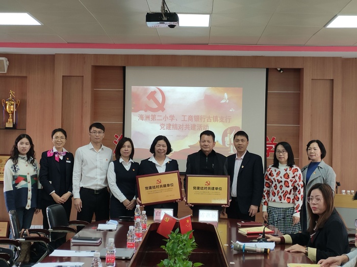 紧接着举行党建结对共建仪式,本环节由古镇镇海洲第??学党支部书记与?商银?古镇??的党支部书记为代表,双方进行党建结对共建互授牌匾,合影留念,标志着本次共建活动正式启动。