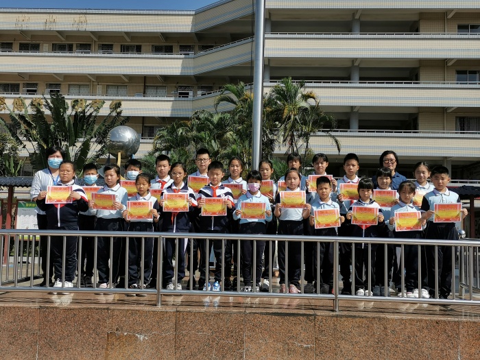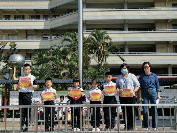邓主任进行活动总结后,各班学生代表接过副校长麦彩英手中的奖状,此时,校园里响起热烈的掌声,同学们都为获奖的班级加油、鼓劲。