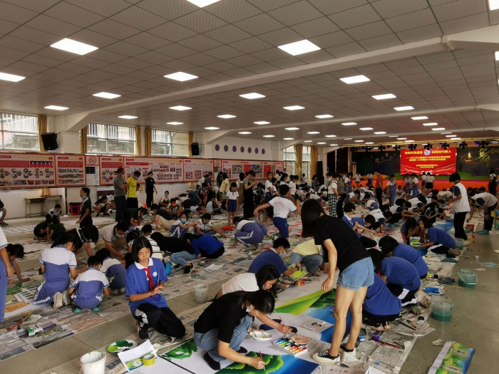 上午8:30,古镇镇美术教研中心组长李桂萍老师的一声令下,参与活动的师生便整齐地蹲在画布前,在洁白的百米画布上尽情涂画。这次绘画以海洲第一小学(海洲国民小学)建校110周年华诞为主题,通过师生们的巧手,描绘海洲第一小学与海洲村的历史。