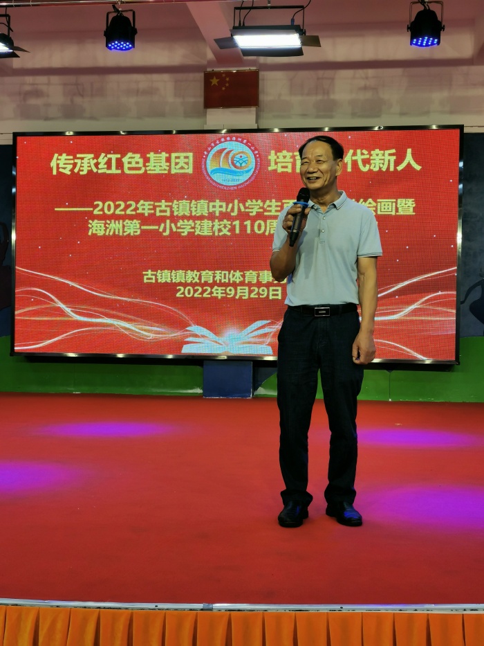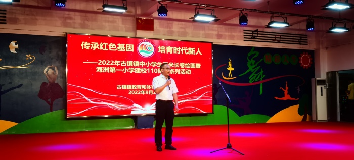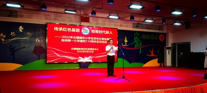 描百载春华,绘今朝蓬勃。2022年中山市古镇镇海洲第一小学迎来110周年校庆,2022年9月29日,在百年老校华诞之际,古镇镇海洲第一小学举办了“传承红色基因 培育时代新人”古镇镇中小学百米长卷绘画活动。参加本次活动的有古镇镇教育和体育事务中心林梗卿副主任,古镇镇教育和体育事务中心孔国范干事,古镇镇书画协会何锦垣会长以及各小学参与活动的师生。