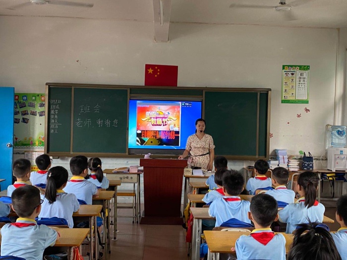 随后,学校教师代表贾如意副校长和学生代表六(4)班刘启程同学进行了庆祝教师节国旗下讲话,开启了“金秋九月颂师恩”活动。贾校长讲到教师一生平凡却甘于平凡,一世艰辛却乐于奉献,他们是文明的使者,是辛勤的园丁;并号召全体同学弘扬尊师重教、感念师恩的美德,在全班、全校、全社会营造人人尊师爱师的良好氛围,从身边点点滴滴做起,热爱老师、关心老师、尊敬老师,并祝所有教师节日快乐、工作顺利。刘启程同学表示饮其流者怀其源,学有成时念吾师;老师诠释着爱与奉献,用粉笔诠释着教书育人的道路,而学生们则用心诠释着对老师的尊敬和感恩。最后,各班主任在班上开展了主题班会,通过精美的图片、温情的讲解让学生再一次感受这个平凡而又伟大的职业——教师。学生们纷纷表示“一日为师,终身为父”,要时刻牢记老师教诲,在校做一名优秀的小学生,在家做一名听话的好孩子。