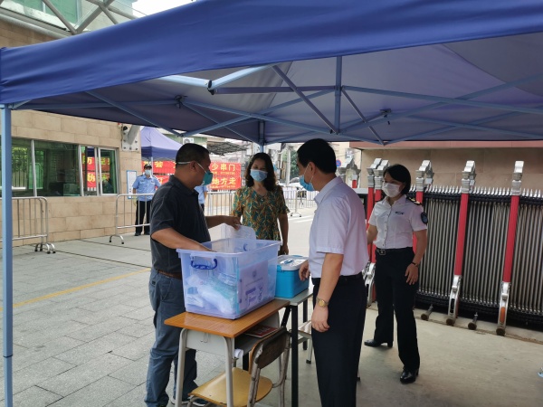 林达光一行从临时隔离室、师生洗手池、学校餐厅、厨房、课室、器材室、保健室、隔离室等地方对学校疫情防控工作和复学准备工作进行现场督导检查,并提出进一步完善的意见和建议。调研中,在二(8)班教室现场询问了该班主任关于疫情应急处理的情况,在餐厅细心检查了厨房人员的卫生状况,在保健室还向学校保健医生询问了各种器材的使用情况。林达光肯定学校疫情防控和复学工作取得成绩的同时,要求学校进一步强化对疫情严峻性的认识,坚决贯彻落实市镇关于疫情防控工作的有关要求,将疫情防控工作抓紧抓细抓实;进一步完善疫情防控各项工作预案,确保防控工作落地落实落细,为开学后应急处置工作做好充分准备。他强调:1.学校要加强培训,每位教师都要熟练这套应急流程;2.各种器材要规范使用;3.开课之前,教师之间互相学习,各项工作落到实处,齐心协力,打赢防疫攻坚战。