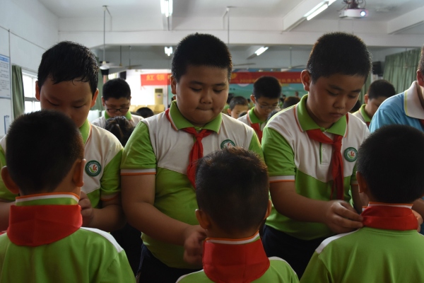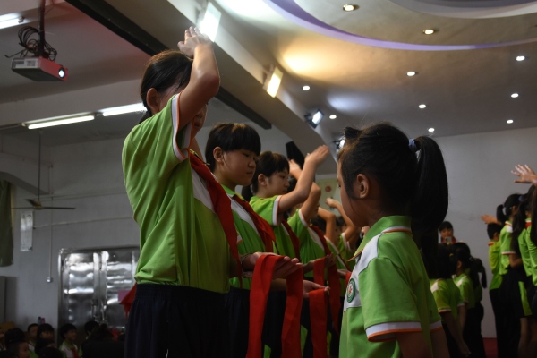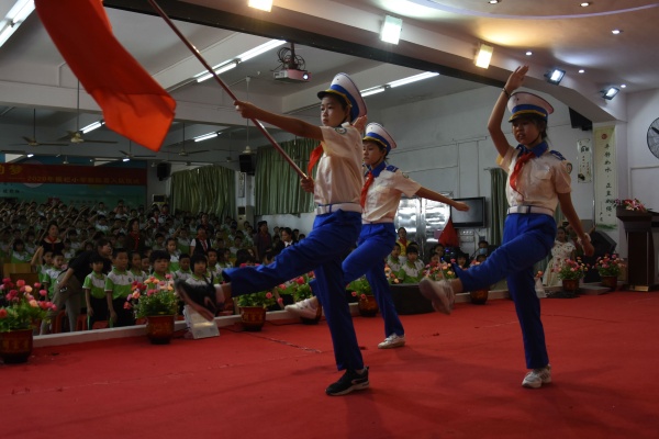在雄壮有力的出旗曲中,少先队入队仪式由此拉开帷幕。接着,在大队长的指挥下,全体队员唱起了《中国少年先锋队队歌》。嘹亮的队歌歌声刚落,主持人宣布了新队员名单,五年级的老队员们纷纷上前为新队员佩戴红领巾。优秀少先队员随后也给中队辅导员授红领巾,大队辅导员给中队辅导员授中队旗。当新队员们都戴上了鲜艳的红领巾后,在该校大队辅导员廖洁怡的带领下,全体新队员郑重地举起右拳,在鲜艳的队旗下庄严宣誓,从此成为一名光荣的少先队员……