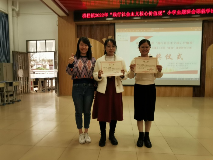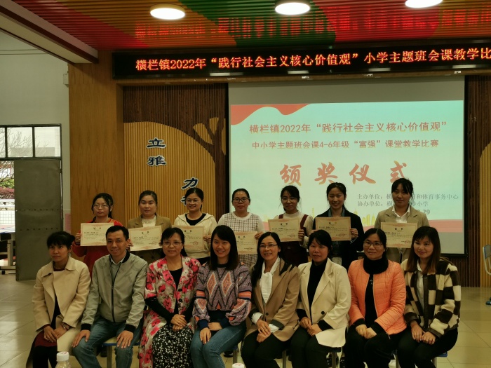 为全面贯彻《中小学德育工作指南》,加强对中小学生社会主义核心价值观的教育引导与实践养成,落实立德树人的根本任务,2022年3月28日,横栏镇2022年“践行社会主义核心价值观”中小学主题班会课教学比赛(第二场)在四沙小学举行。经过一天的角逐,第二小学熊潇崎老师荣获一等奖,四沙小学司徒嘉颖老师和横栏小学李晓清老师荣获二等奖,伟智学校陈秋燕老师、三沙小学龚云丹老师、港源学校范松钰老师和华文学校何芷茵老师荣获三等奖。横栏镇教育和体育事务中心德育专干黄丽君为获奖的老师们颁发了荣誉证书。